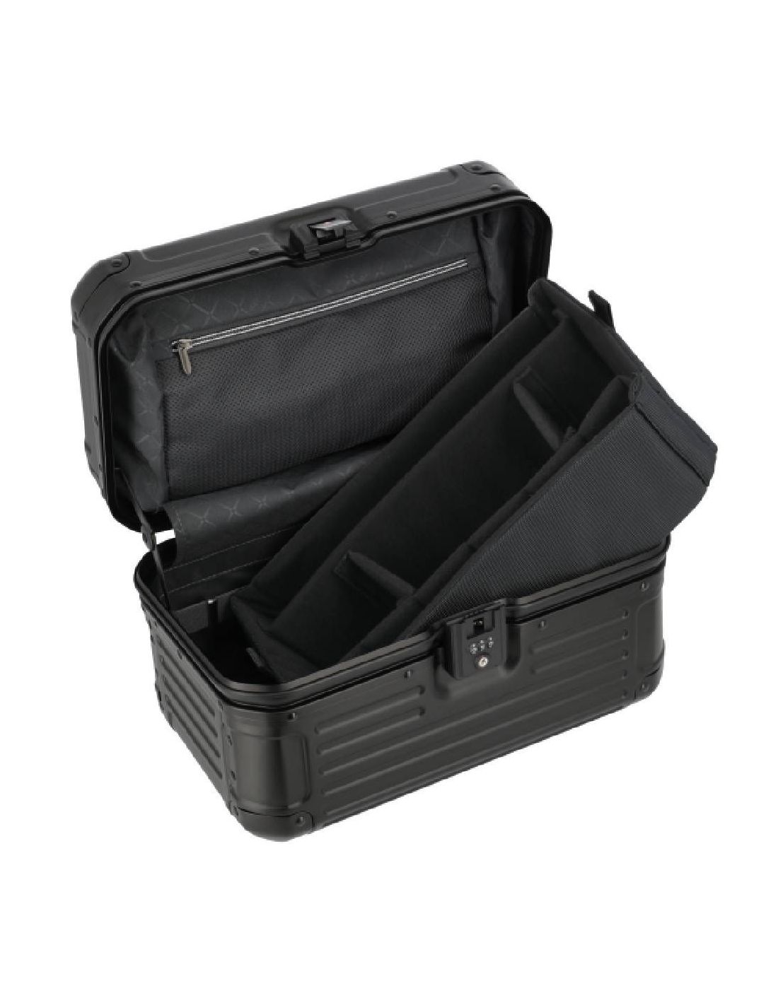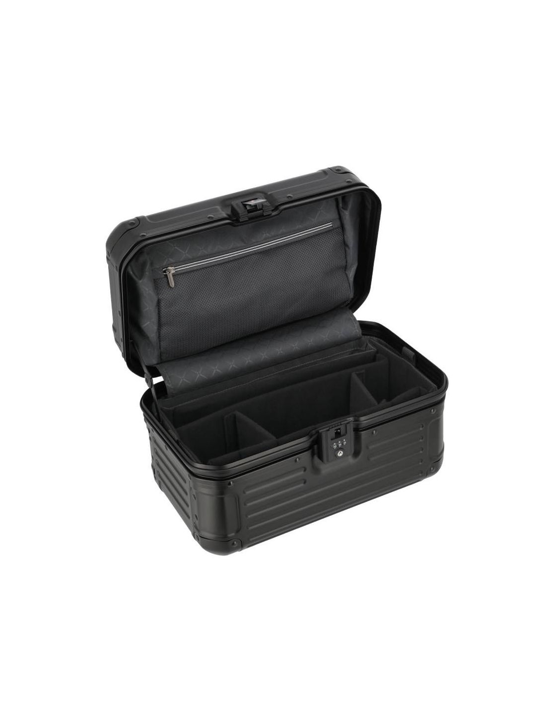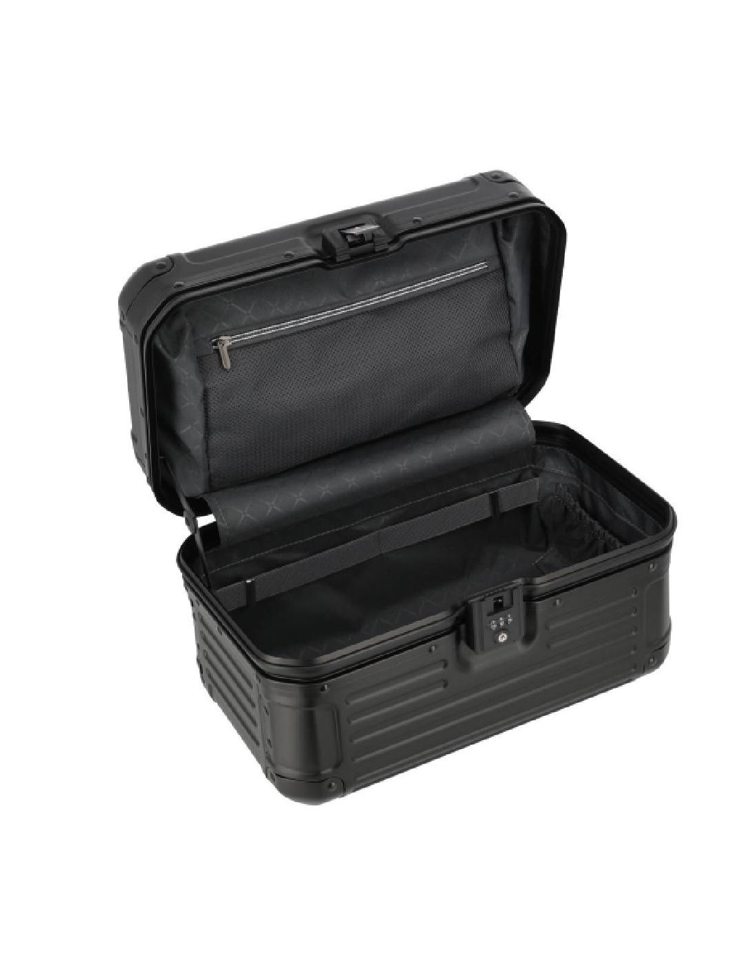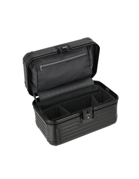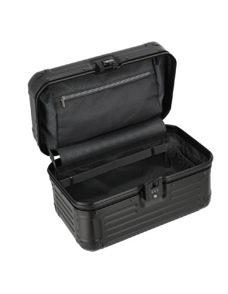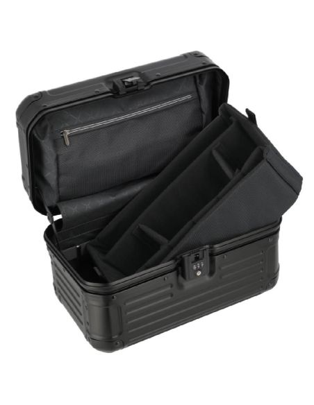 De beautycase is voorzien van een klemsluiting met een TSA-slot voor extra veiligheid. Bij het openen ontvouwt zich een doordacht ontworpen interieur met een ritsvak, diverse insteekvakken en een elastiekenband om lotions of parfum handig vast te zetten. Het uitneembare gedeelte fungeert als een organizer, waardoor je al je essentiële items geordend en overzichtelijk kunt opbergen. Hierdoor draag je al je benodigdheden met stijl en organisatie met je mee.