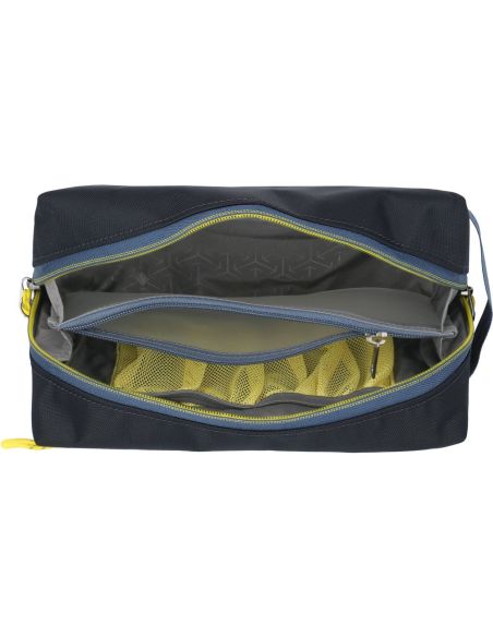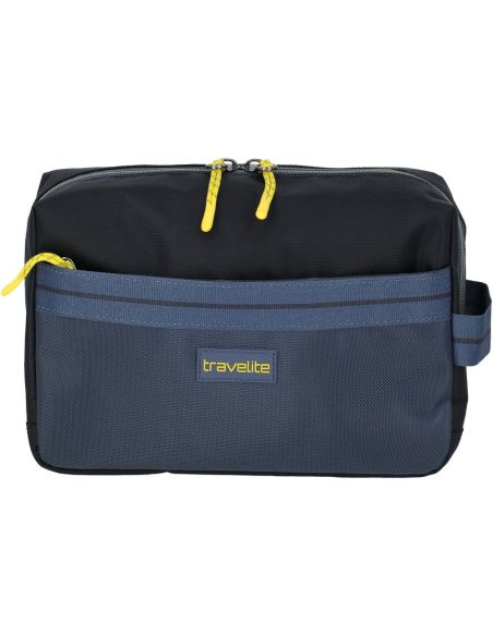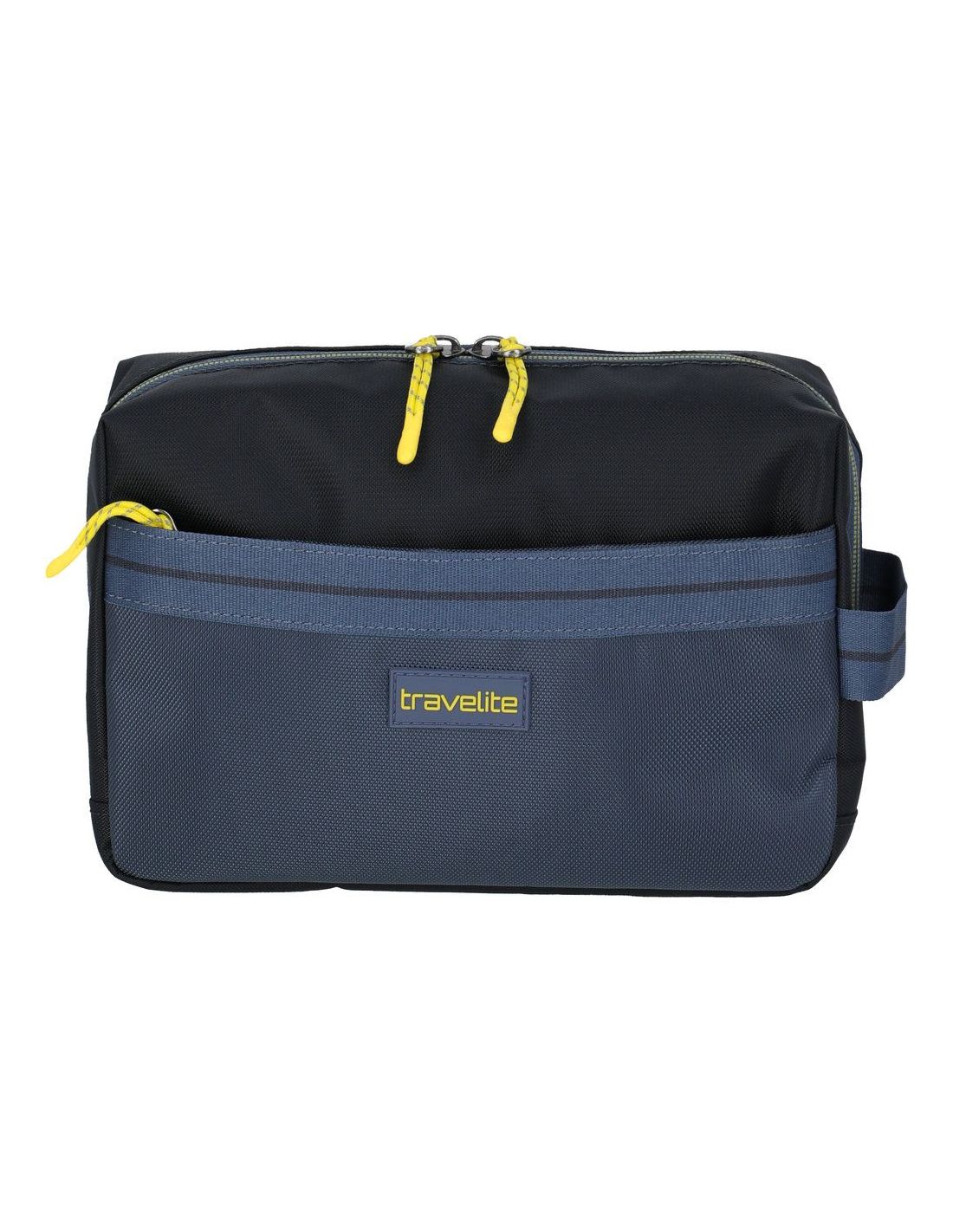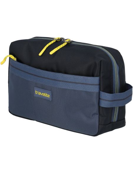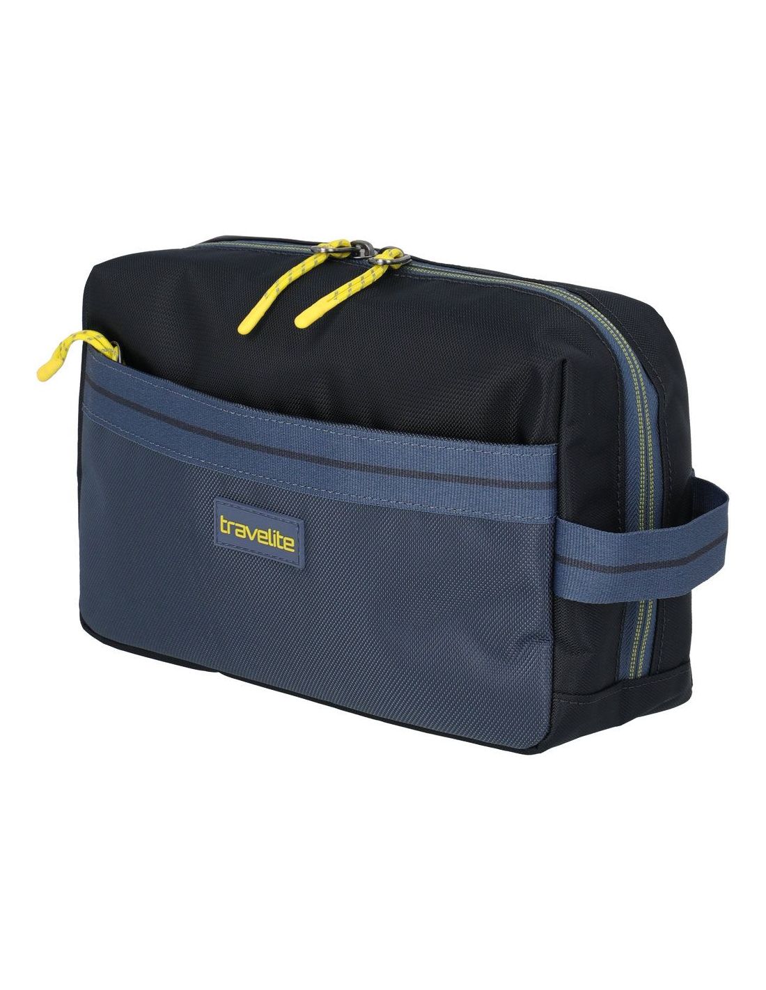 Compacte toilettas van het merk Travelite, ontworpen voor wie stijlvol en georganiseerd op reis wil gaan. Deze tas is uitgevoerd in zwart en donkerblauw met contrasterende gele ritstrekkers, wat zorgt voor een sportieve en moderne uitstraling.