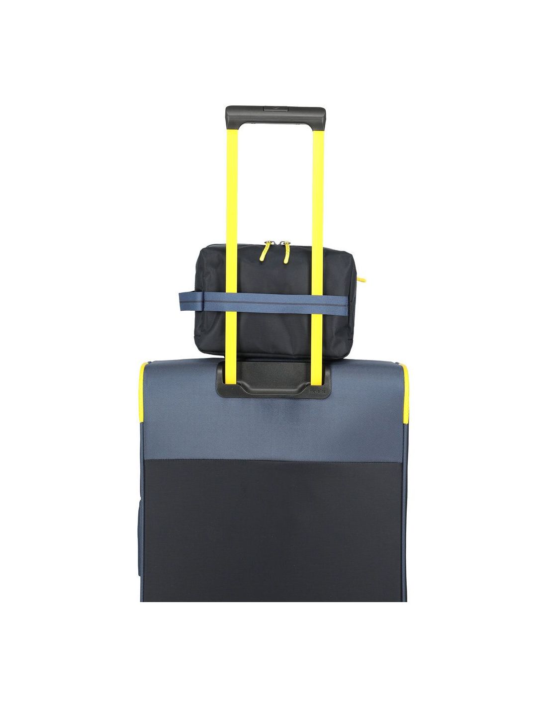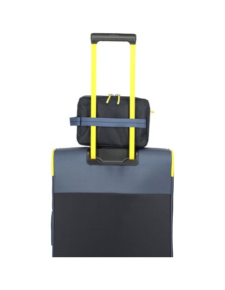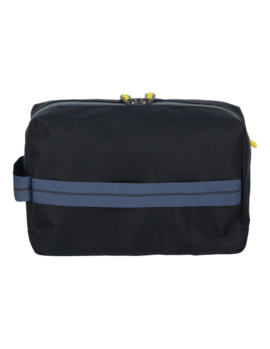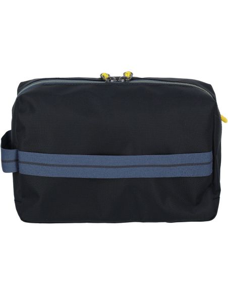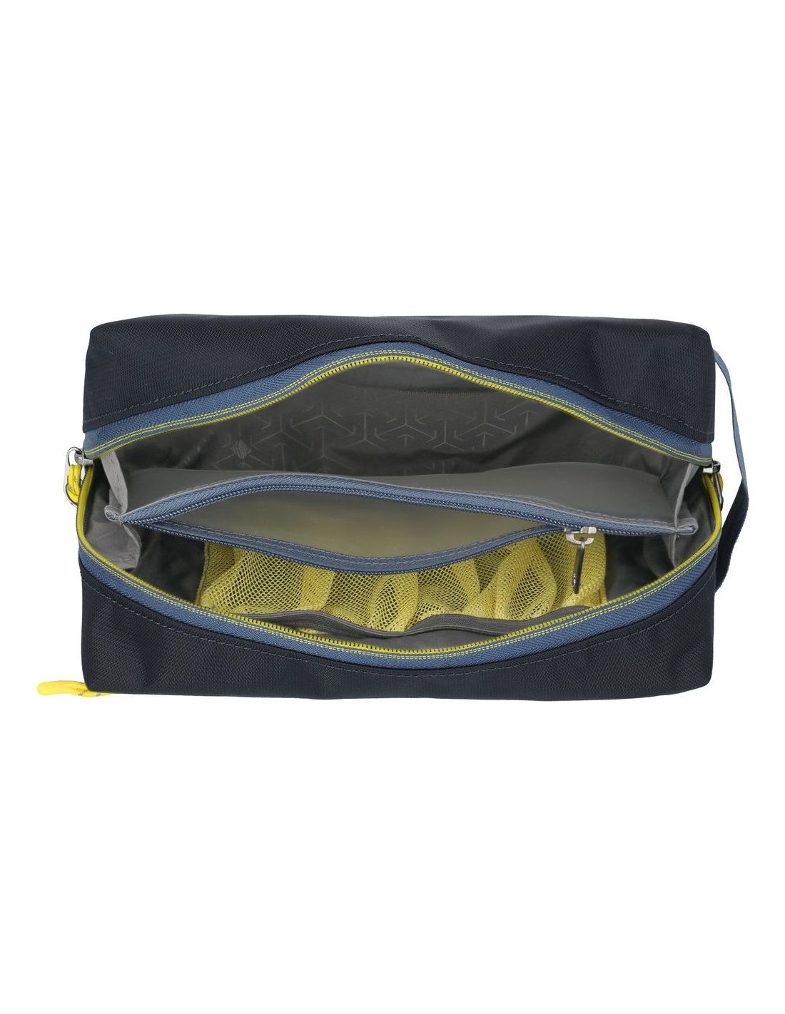 Compacte toilettas van het merk Travelite, ontworpen voor wie stijlvol en georganiseerd op reis wil gaan. Deze tas is uitgevoerd in zwart en donkerblauw met contrasterende gele ritstrekkers, wat zorgt voor een sportieve en moderne uitstraling.