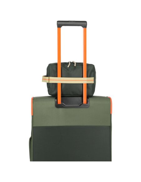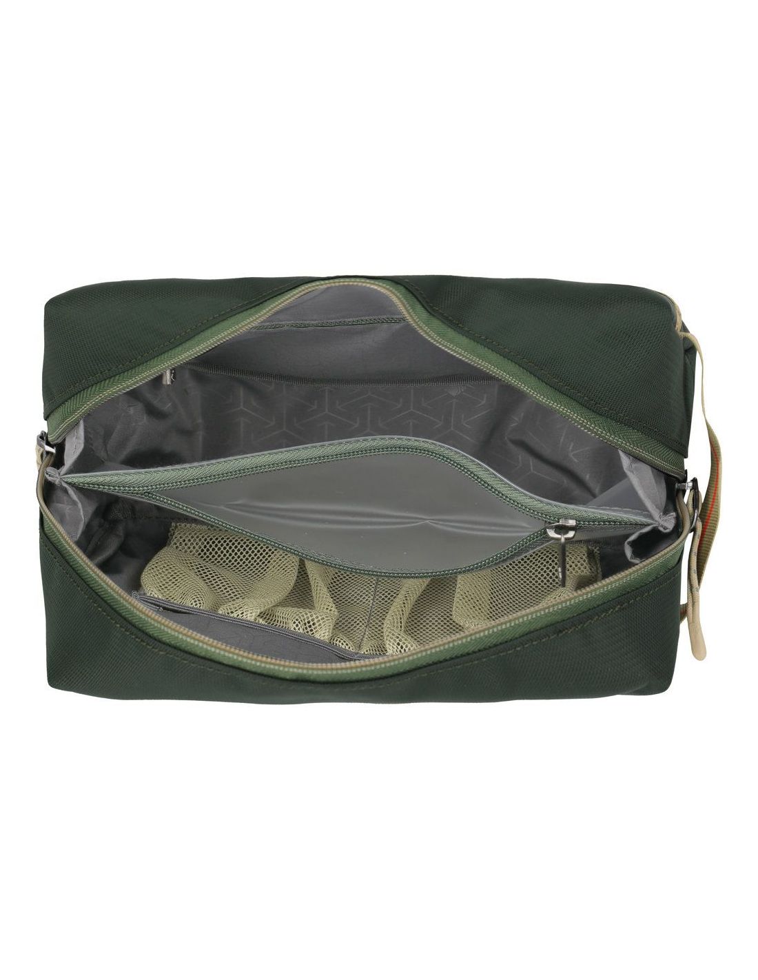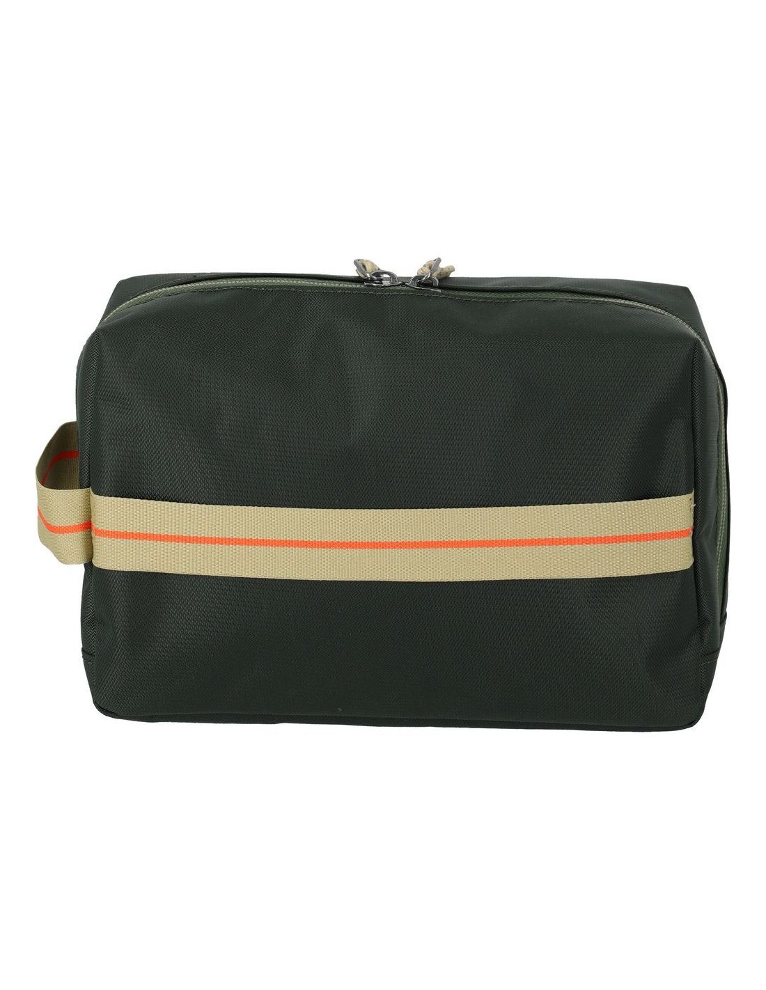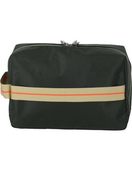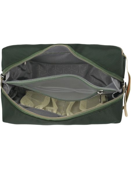De toilettas is gemaakt van stevig gerecycled polyester dat goed bestand is tegen dagelijks gebruik en vocht. De tas heeft een ruim hoofdvak met ritssluiting, waarin alle toiletartikelen overzichtelijk opgeborgen kunnen worden. Dankzij de brede opening is de inhoud gemakkelijk bereikbaar. Aan de voorzijde bevindt zich een extra steekvak voor kleinere benodigdheden zoals een tandenborstel of kam. De stevige draaglus aan de zijkant zorgt ervoor dat de tas eenvoudig kan worden meegenomen of opgehangen.