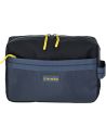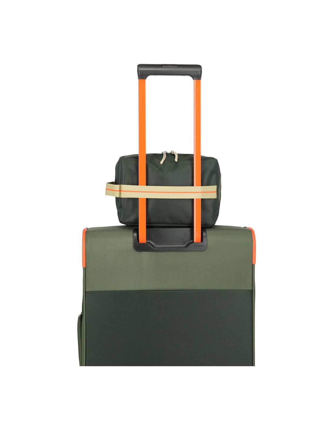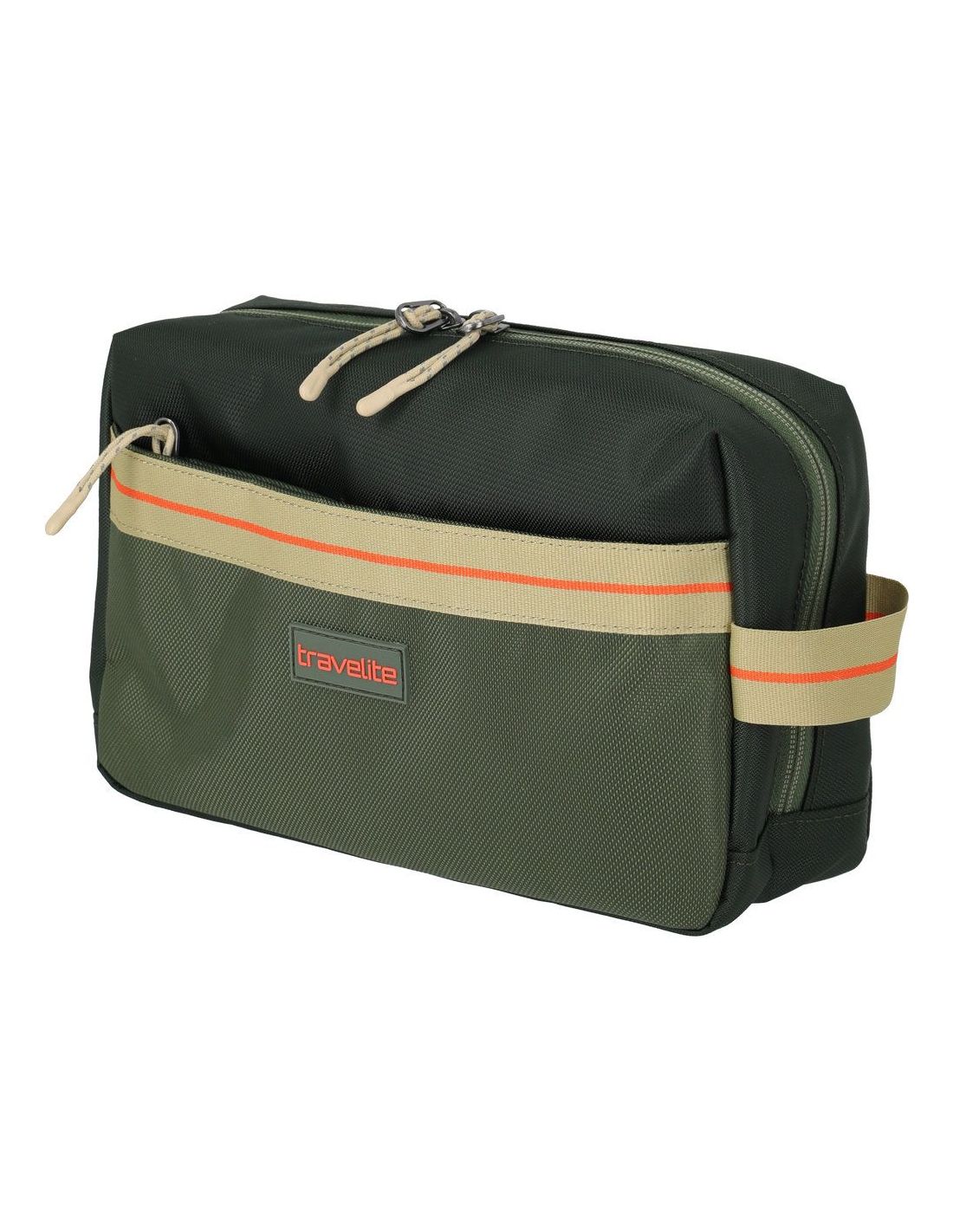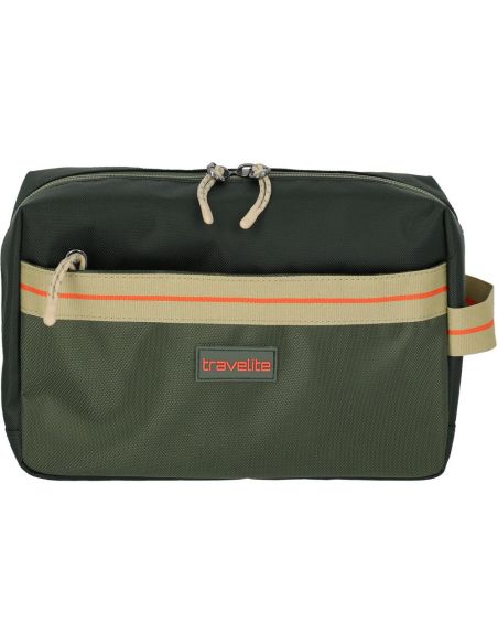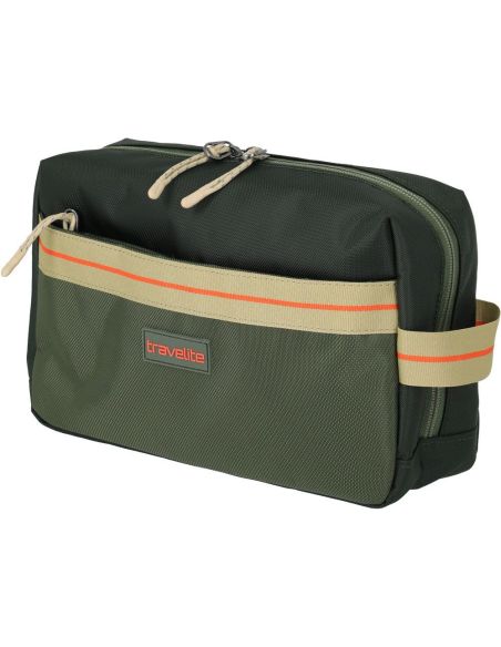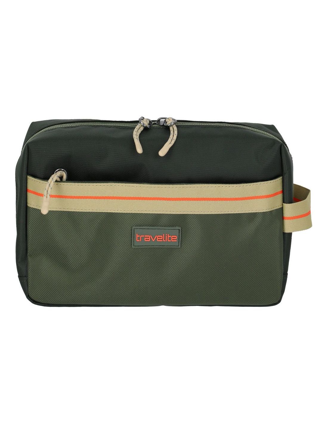 Compacte toilettas van het merk Travelite, ontworpen voor wie stijlvol en georganiseerd op reis wil gaan. Deze tas is uitgevoerd in zwart en groen met contrasterende gele ritstrekkers, wat zorgt voor een sportieve en moderne uitstraling.
