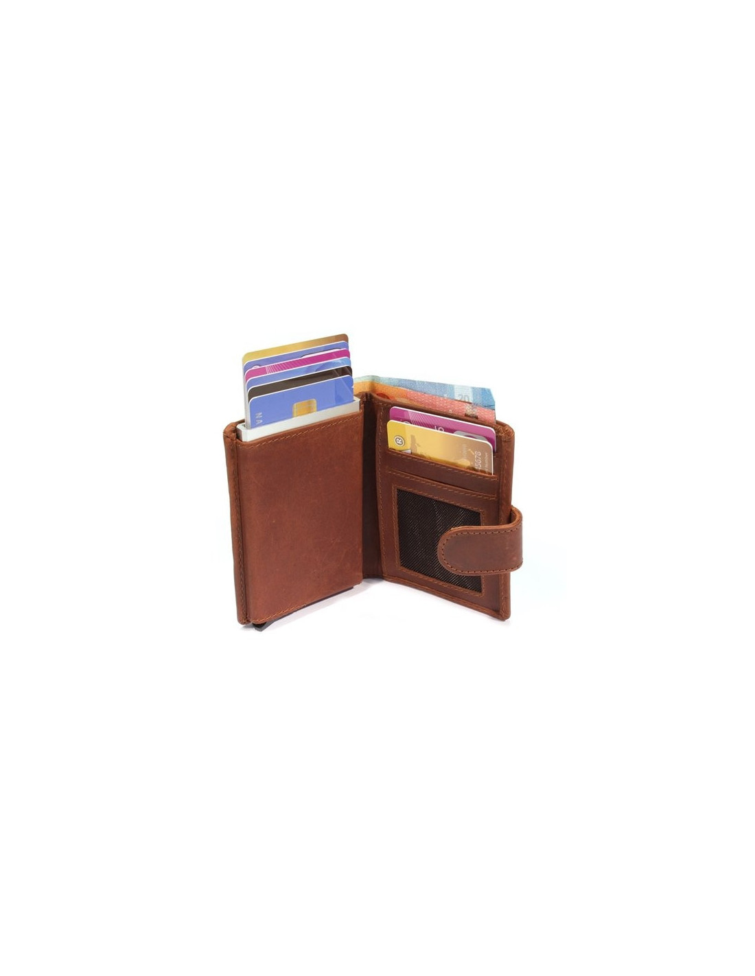 In de Card protector heeft plaats voor 6 kaarten. Met een een schuifje krijg je de kaartje trapsgewijs uit de card protector. In het leren hoesjes is er nog plek voor 3 andere pasjes, muntgeld en briefgeld.