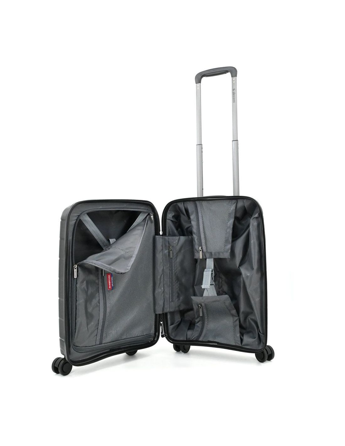 De Decent Straight Line handbagagekoffer met vier wielen is een praktische en stijlvolle keuze voor korte reizen. Dankzij het compacte ontwerp is de koffer ideaal voor gebruik als cabinebagage. Het stevige polypropylene koffer biedt uitstekende bescherming voor alle persoonlijke spullen, terwijl de horizontale lijnen op het oppervlak zorgen voor een moderne uitstraling.