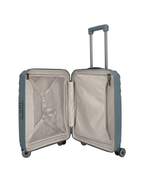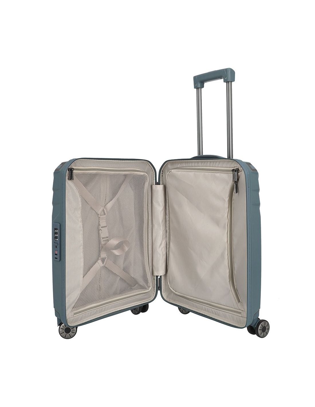 De Travelite Elvaa handbagagekoffer Blauw Grijs met een hoogte van 55 cm vertegenwoordigt een uiterst robuuste en lichtgewicht reeks koffers. Vervaardigd uit duurzaam polypropyleen draagt de Travelite Elvaa koffer niet alleen bij aan stevigheid maar ook aan een opmerkelijk lichtgewicht ontwerp. Het ontwerp omvat twee royale hoofdcompartimenten met inpakriemen die moeiteloos met een rits kunnen worden afgesloten, waardoor je bagage ordelijk blijft tijdens het reizen.