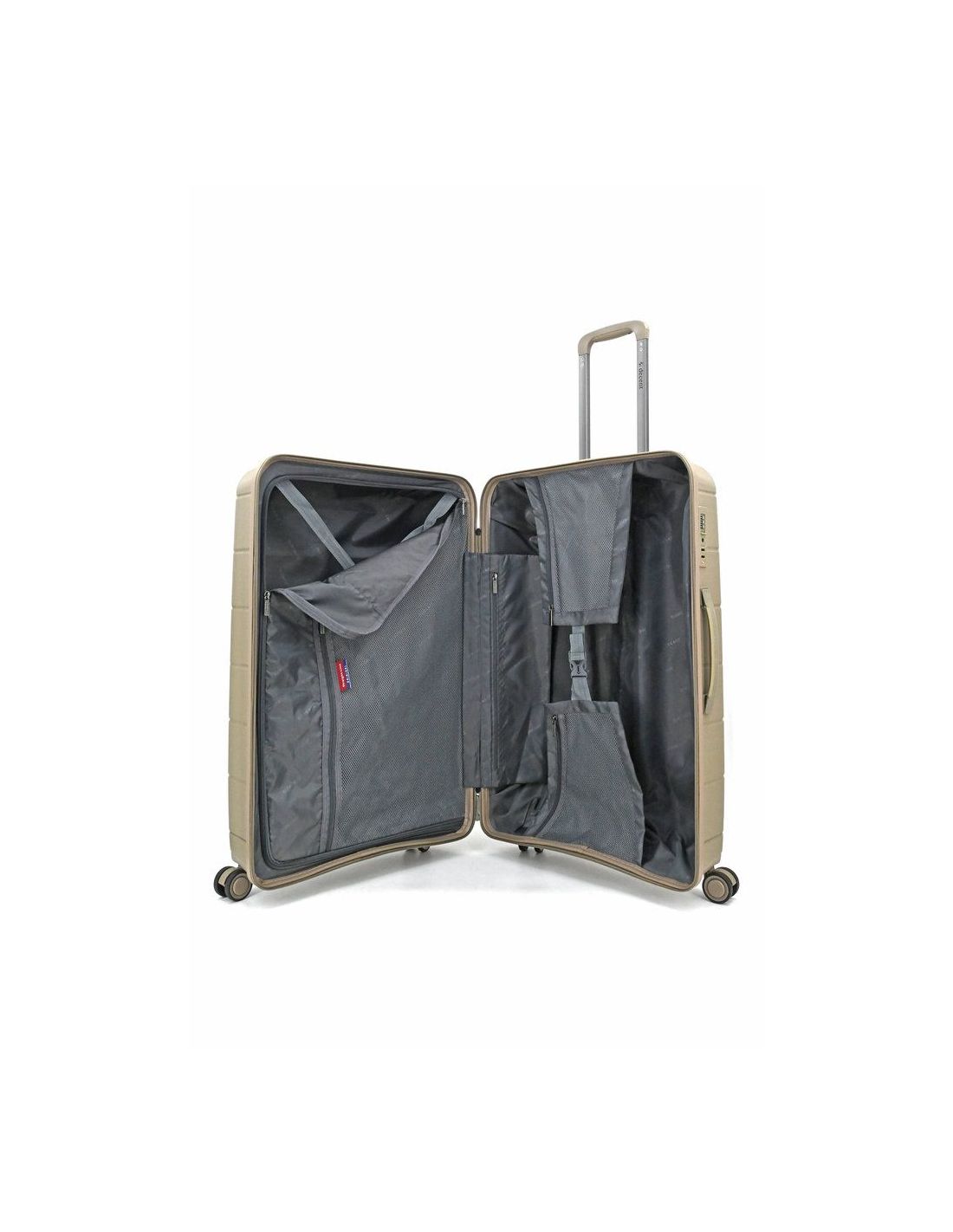 Binnenin biedt deze koffer veel overzicht en ruimte. Meerdere ritsvakken, een afsluitbaar tussenschot en elastische pakriemen zorgen ervoor dat alles georganiseerd blijft. De voering is uitgevoerd in een neutrale kleur en bevat praktische opbergmogelijkheden voor kleinere spullen en accessoires.