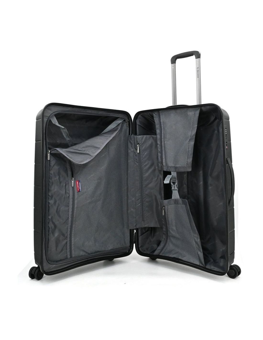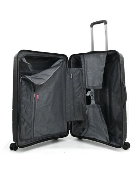 Binnenin biedt deze koffer veel overzicht en ruimte. Meerdere ritsvakken, een afsluitbaar tussenschot en elastische pakriemen zorgen ervoor dat alles georganiseerd blijft. De voering is uitgevoerd in een neutrale kleur en bevat praktische opbergmogelijkheden voor kleinere spullen en accessoires.