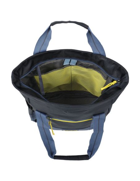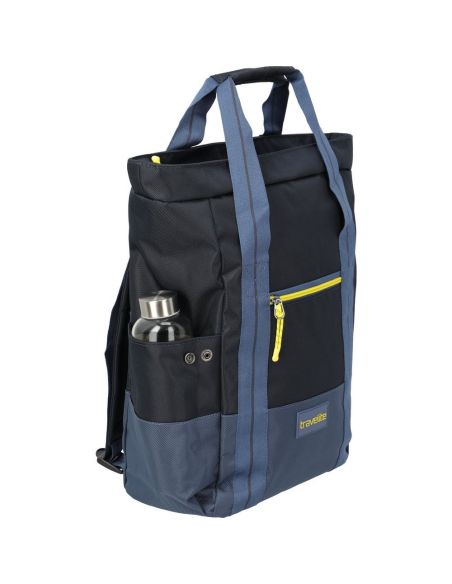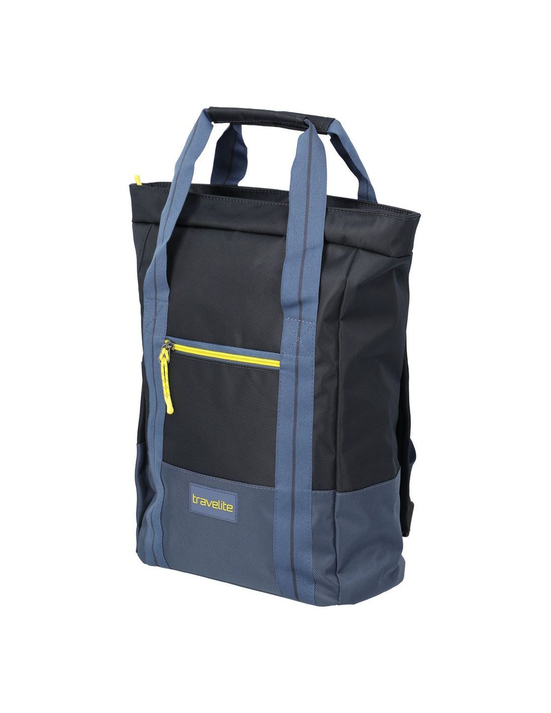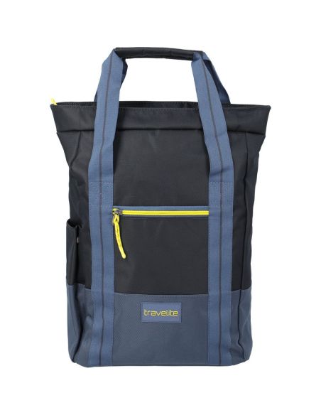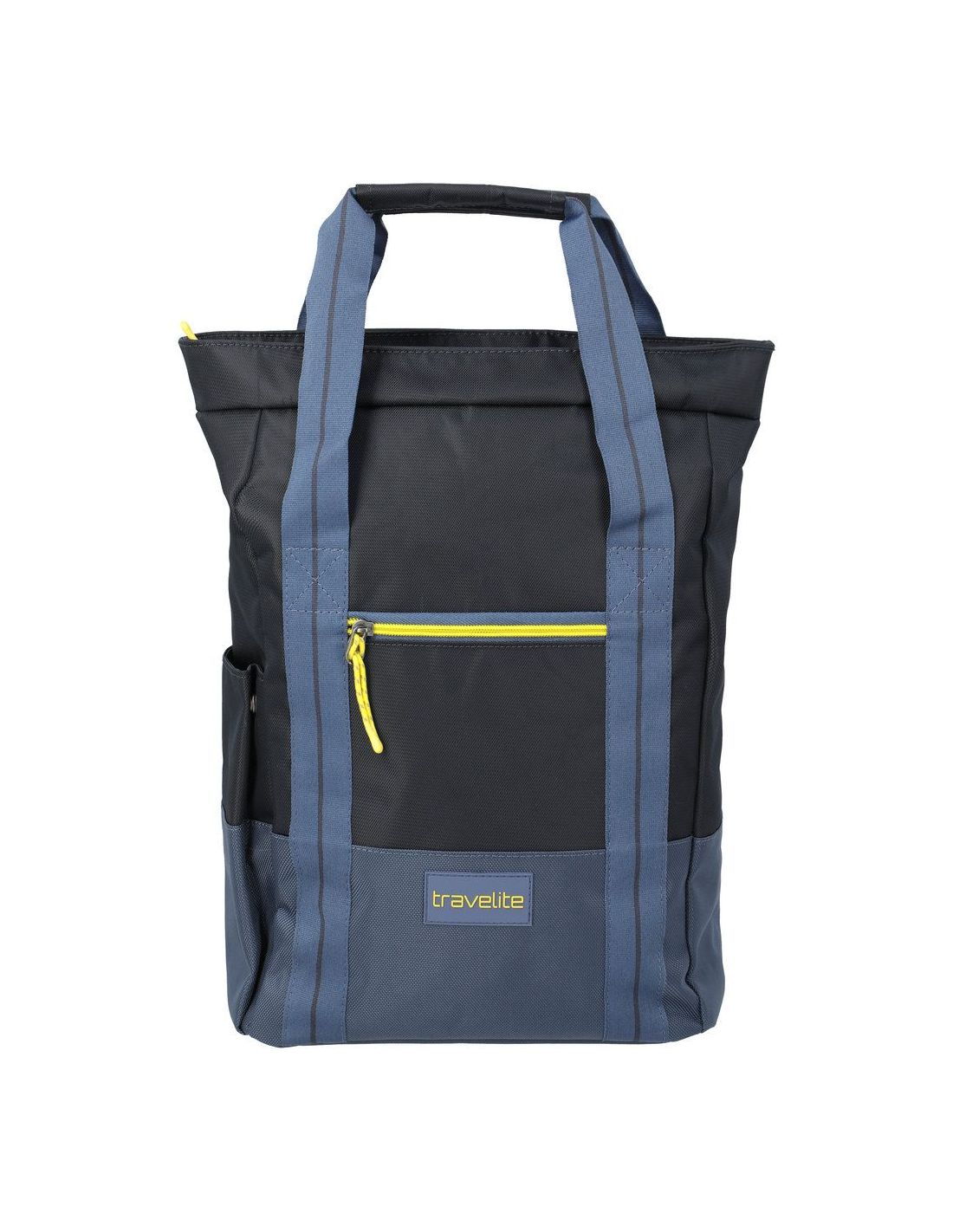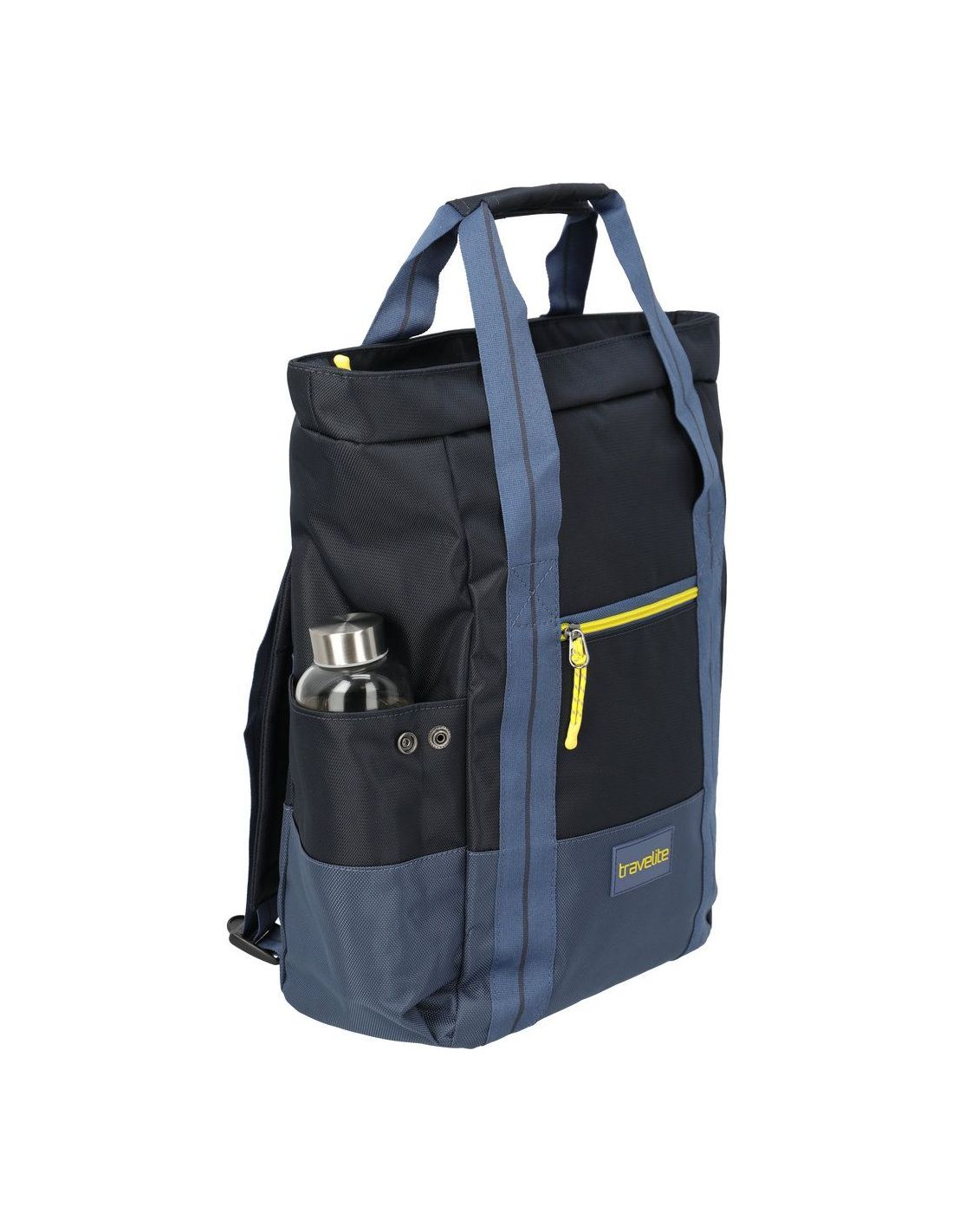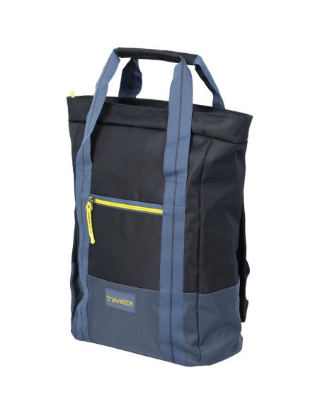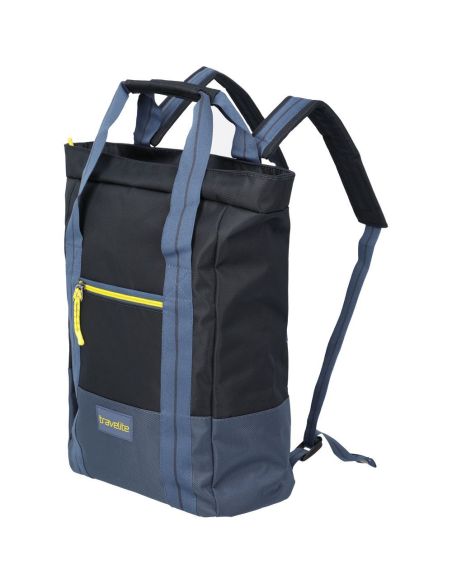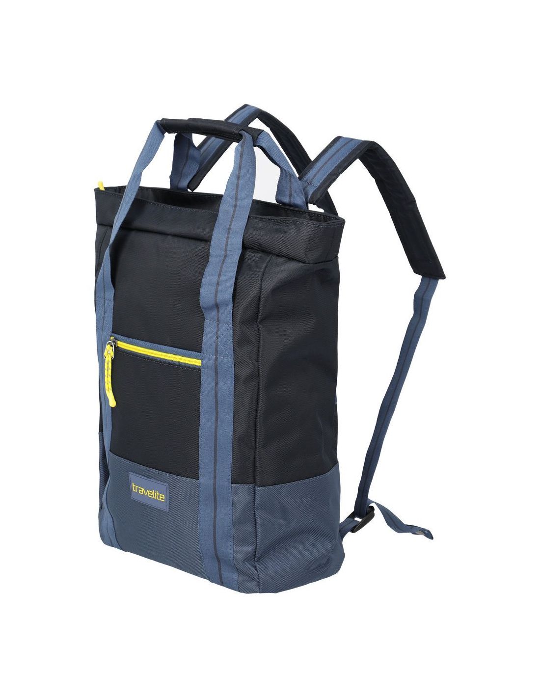 Veelzijdige rugzak van Travelite met sportieve uitstraling, perfect voor dagelijks gebruik of als extra tas tijdens het reizen. Het moderne ontwerp in zwart met blauw en opvallende gele accenten geeft de tas een frisse en eigentijdse look.
