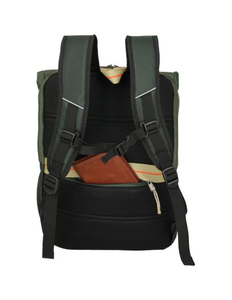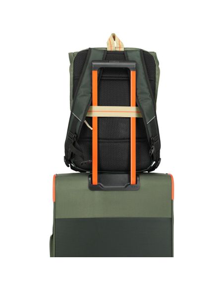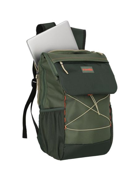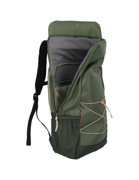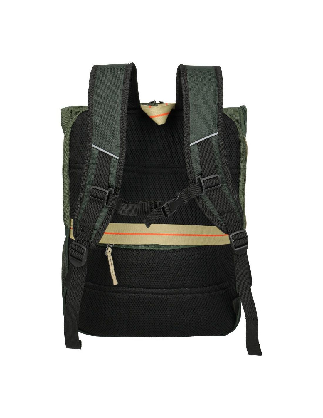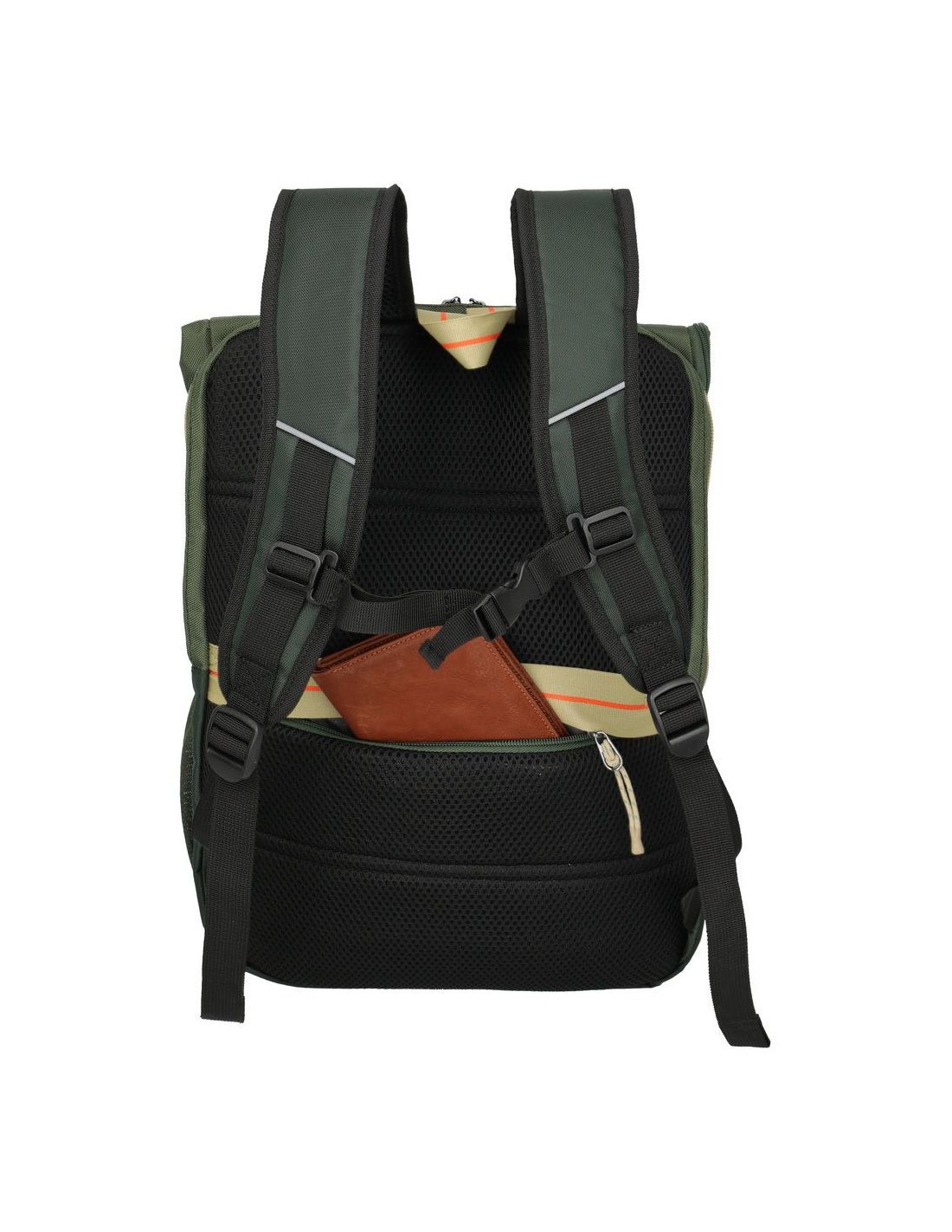 Stoere rugzak in olijf groene tinten, ontworpen voor wie houdt van een sportieve en praktische stijl. De combinatie van donkergroen met beige accenten en oranje details zorgt voor een opvallende en moderne uitstraling. De rugzak heeft een ruime indeling en biedt volop mogelijkheden om spullen georganiseerd mee te nemen.