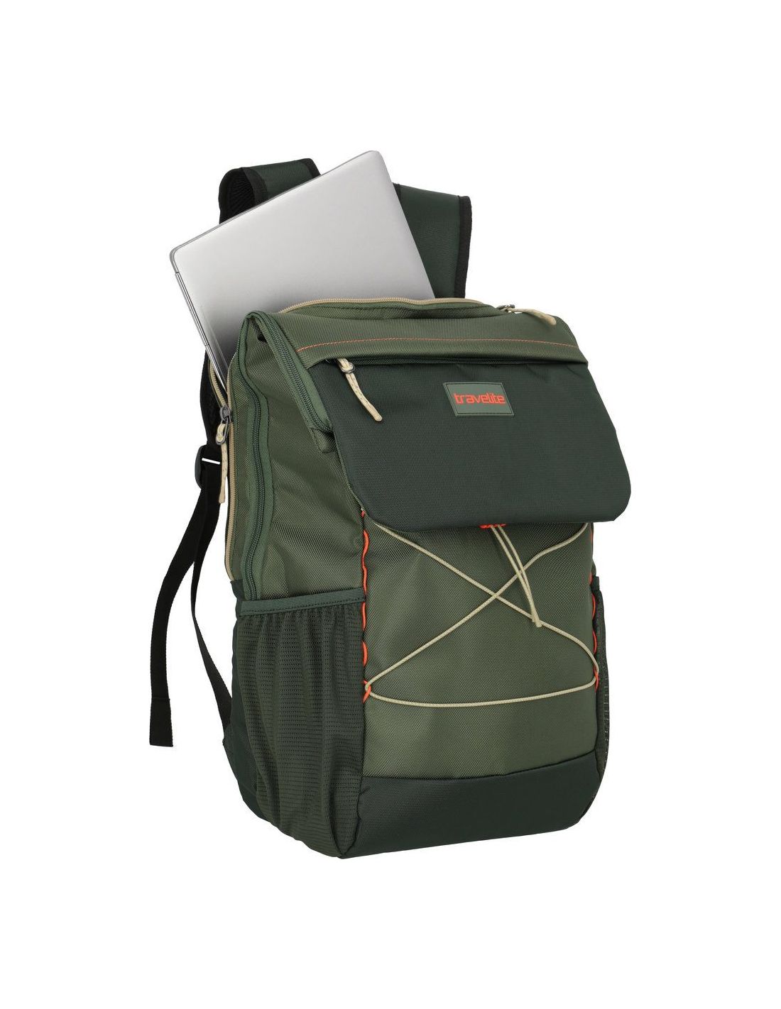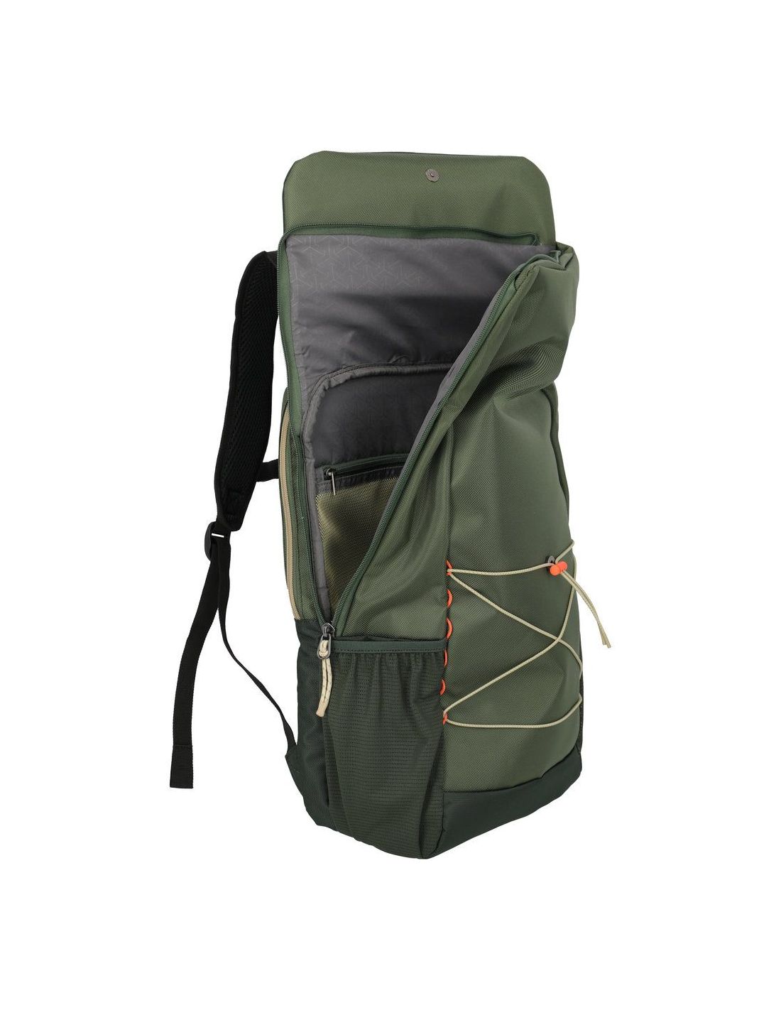 Voorop zit een groot klepvak met rits, handig voor het opbergen van kleine benodigdheden. Daaronder is een elastisch koordsysteem bevestigd, ideaal voor bijvoorbeeld een jas of extra trui. Het hoofdvak heeft een brede opening met ritssluiting en biedt ruimte aan grotere items. Binnenin zit een apart vak voor een laptop of tablet, waardoor deze rugzak geschikt is voor zowel dagelijks gebruik als reizen. Aan beide zijkanten bevinden zich mesh-vakken, perfect voor drinkflessen of paraplu's.