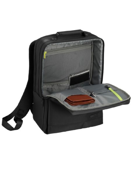 De rugzak is gemaakt van hoogwaardige en slijtvaste gerecycled nylon. Dankzij de gewatteerde schouderbanden en de ventilerende rugzijde draagt de rugzak comfortabel, zelfs bij een volle belasting. Ook is de Workfloow rugzak voorzien van een opbergvakje aan de achterkant, waarmee je veilig items kan opbergen.